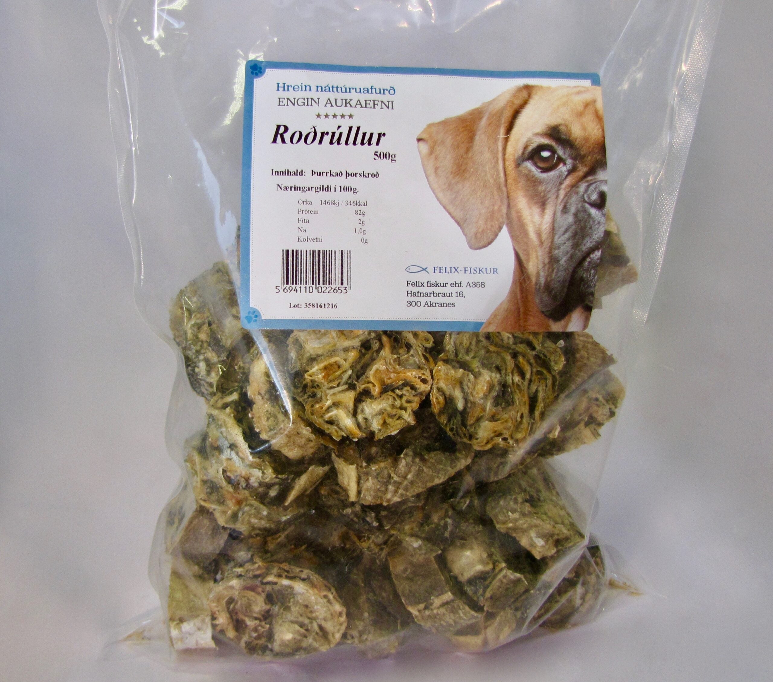 Roðrúllur úr þurrkuðu þorskroði. Hrein náttúruafurð án aukaefna.