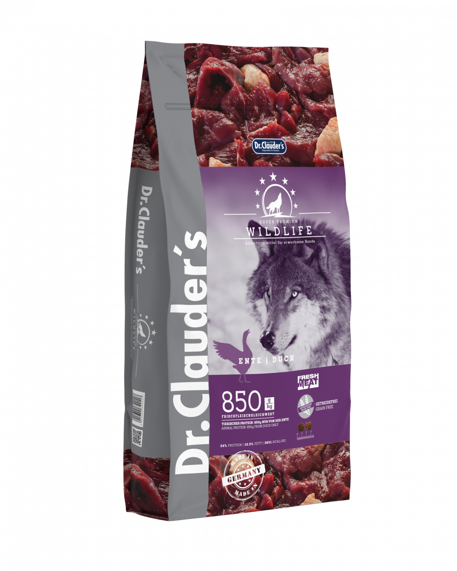 Wildlife Duck er án kornmetis og það eru 850gr af fersku andarkjöti í hverju kg. Wild Life Duck inniheldur grænmeti, ávexti og jurtir ásamt önd, sætum kartöflum og berjum. Inniheldur hátt hlutfall B vítamína. Það er "mono protein" þar sem kjötið er af einni tegund, en ekki blanda margra kjöttegunda.
