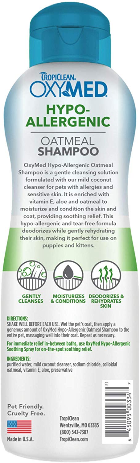 Oxy-Med® Hypo-allergenic sjampóið er samsett til að hreinsa vel ásamt því að hafa róandi, mild áhrif á húð dýra með ofnæmi, kláða eða þurrk í húð. Inniheldur milda blöndu kókoshnetuhreinsis sem hefur góð áhrif á húð og feld. E vítamín, aloe og hafrar veita raka og næra húð og feld.